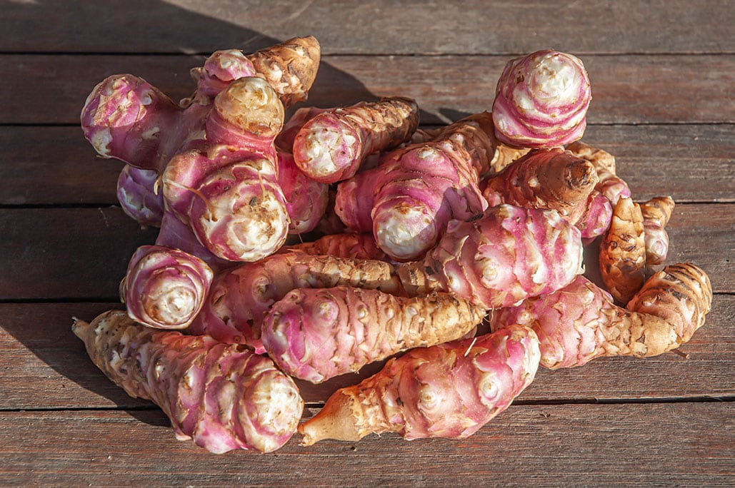 Topinambour dont la peau et la chair sont de couleur rose. Parfois appelé artichaut de Jérusalem, ce légume racine a une saveur rappelant celle de l’artichaut. Se consomme généralement cuir mais est également délicieux cru râpé.